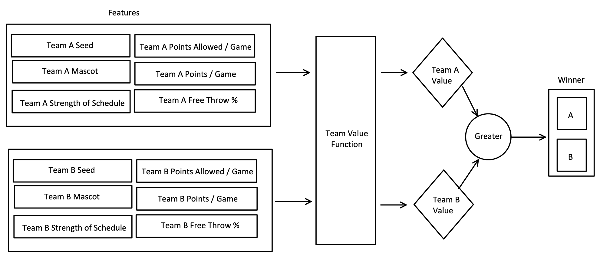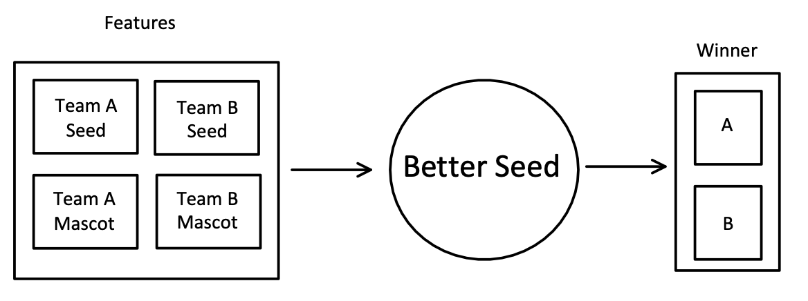 This is a pretty straightforward idea that performs decently well historically! This rule is extremely biased, which is the purpose of using it. The bias we are using comes from the committee seeding the teams. The committee is made up of experts who take time to study and evaluate each team individually, and the seed they assign a team reflects how good they believe the team to be. If we are to trust these experts, we could use this simple rule. This rule is extremely easy to use, but we run into the problem of what to do when we encounter a game between two teams of the same seed, for that, let's just pick a non-biased comparison like the name of the team's mascot.