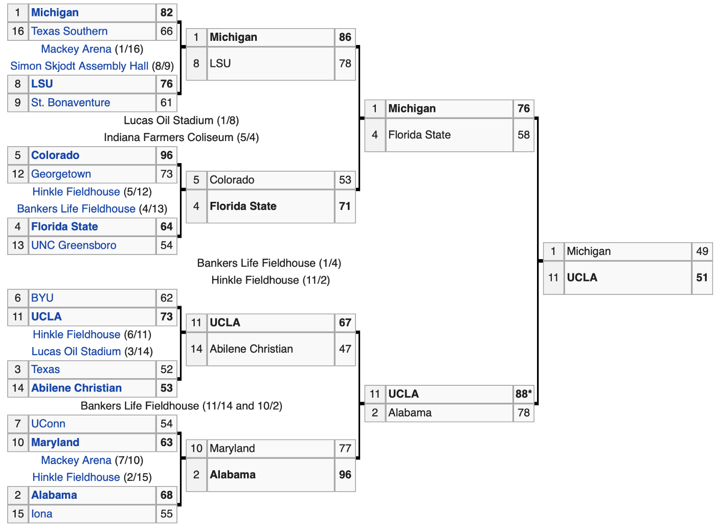 Looking at the top half of the regional I am feeling really good about this rule and then…what happened? Well, between an 11 seeded UCLA Bruin team making an incredible run to the Final Four and a 59% free throw shooter hitting two free throws with 1.2 seconds left to beat Texas: we got March Madness'd.